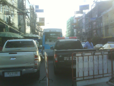 還有兩台大型警車在路口堵車,一般車輛是不准進入考山路的。在警備車前面是一台比遊覽車小一點的銀行匯兌車。在曼谷街頭走五步路就可以看得到匯兌的小店,沒想到在這裡有銀行派出來的專車,由此可知曼谷是真的重視觀光,我帶的泰銖夠沒去接受過服務。