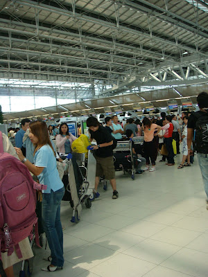 剛開始以為華航前面大排長龍實在很厲害,後來才發現辦理出境的地方才是人擠人,擁擠的情況不由自主跟「大陸人排隊」快有得拼了。(不懂啥是「大陸人排隊」請上GOOGLE搜尋,保證笑出眼淚。)